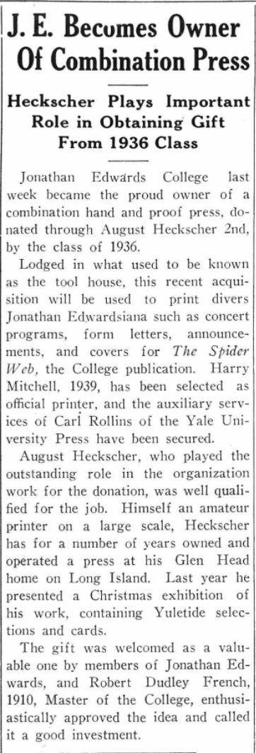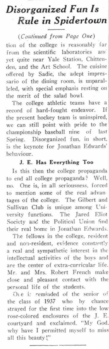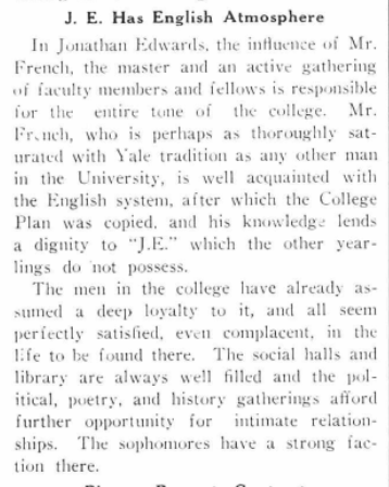 Recently, Jennifer Julier JE ’77 posted in the JE Trust Facebook group about a JE factoid she had found in the Yale Daily News archive. What follows are excerpts from the residential college’s early history that, like the factoid Julier shared, tell in part how JE’s culture emerged at a time when it, like the rest of Yale’s residential colleges in the 1930s, was a nascent dormitory community still laying its roots. A list of resources that allow other JE alums to dive deeper into this history follows the excerpts below.