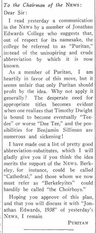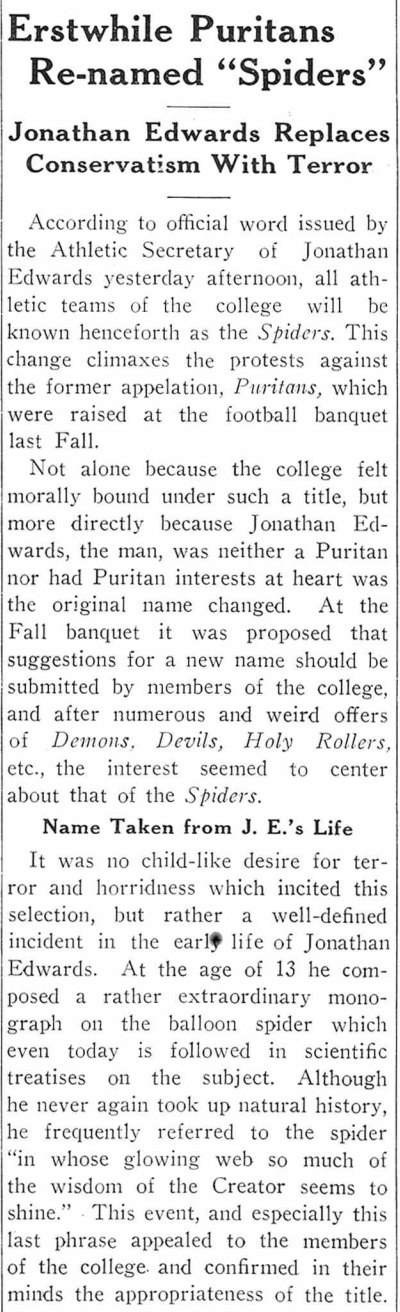 In a series of letters to the editor in 1935, JE students wrote about changing the JE team name. Although “Angry Gods” is mentioned, it’s a wonder no one suggested “Sinners,” the unofficial, irreverent nickname JE students sometimes go by today. By January 1936, JE’s team name had officially switched from “Puritan” to “Spider,” with “Spider” still serving as the moniker for JE students today. The move away from “Puritan” also increased JE’s historical accuracy, as Jonathan Edwards’s time as a congregationalist Great Awakening minister followed the height of Puritanism in the region by several decades.