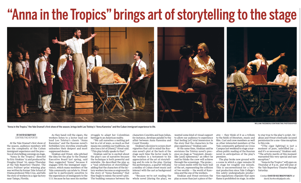 I broke another rule when I directed Anna in the Tropics, which is a play about a cigar factory. We staged it in the Yale Rep as one of the Dramat plays, and up until that point—well, probably still—you weren’t allowed in student productions to smoke on stage or light anything on fire. I think candles weren’t allowed either. But, you know, it’s a play about the making of cigars. There’s a very important moment in the play when a cigar is lit, and all of the main characters take a puff, and the rule was, no, we can’t do it, but I fought really, really hard, and we did it. In the end, I don’t know how that rule was bent or broken.
