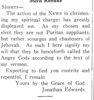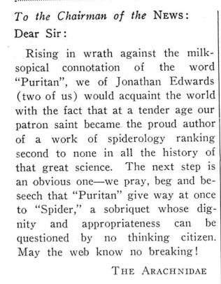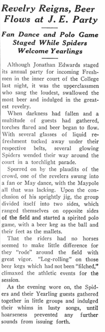 In a series of letters to the editor in 1935, JE students wrote about changing the JE team name. Although “Angry Gods” is mentioned, it’s a wonder no one suggested “Sinners,” the unofficial, irreverent nickname JE students sometimes go by today. By January 1936, JE’s team name had officially switched from “Puritan” to “Spider,” with “Spider” still serving as the moniker for JE students today. The move away from “Puritan” also increased JE’s historical accuracy, as Jonathan Edwards’s time as a congregationalist Great Awakening minister followed the height of Puritanism in the region by several decades.